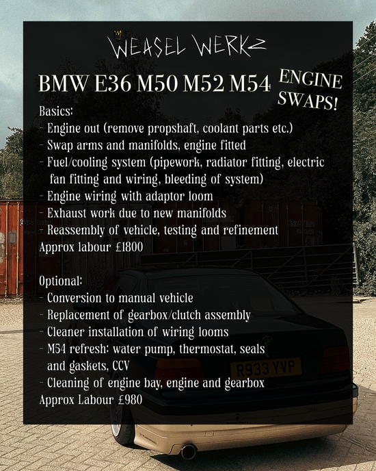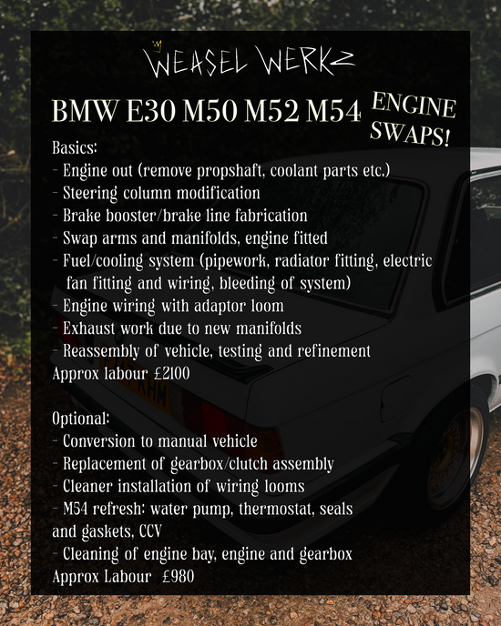 We are also able to offer complete S50, S52 and S54 engine swaps. These prices differ slightly to what is stated above due to additional fabrication involved, please contact us for more information!